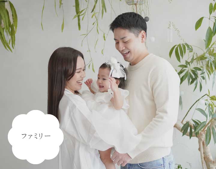 マタニティフォト、ニューボーンフォト、お宮参り、バースデー、ファミリー、七五三など