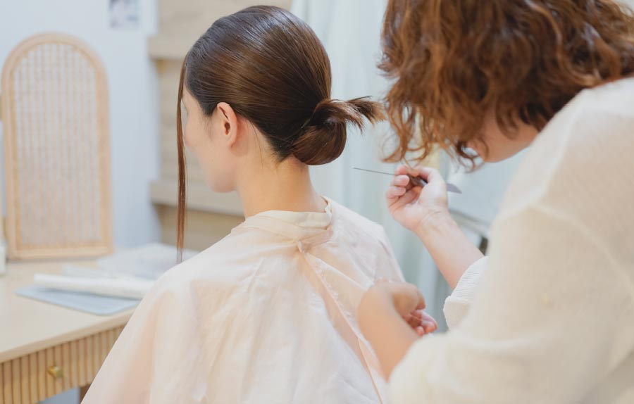 ヘアセットがある場合、前開きのお洋服でお越しいただきますとお着替えがスムーズです。