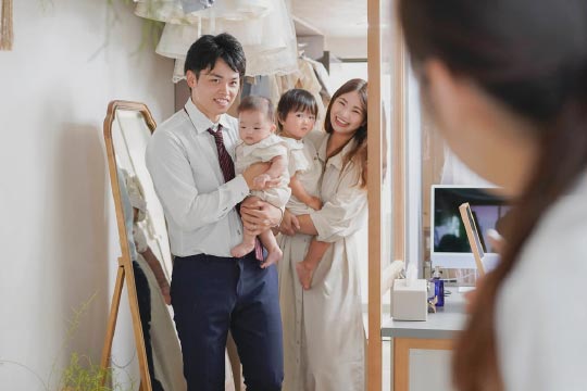 スタジオ内でご家族様での全身立ち姿を撮影する場合もございますので、お洋服に合わせた靴でご来店下さい。 -